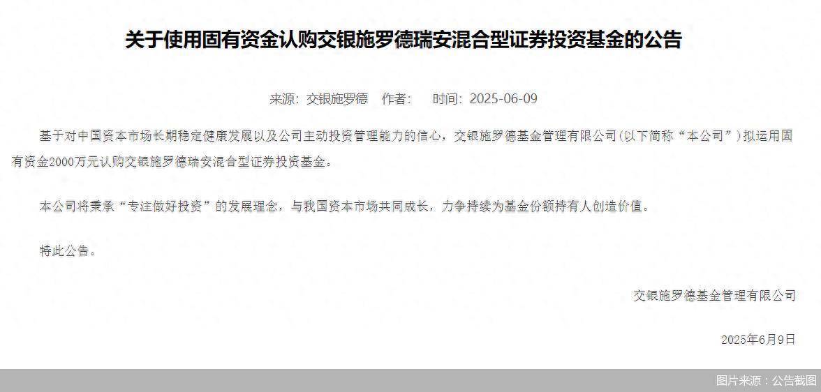 6月9日,交银施罗德发布公告表示,基于对中国资本市场长期稳定健康发展以及公司主动投资管理能力的信心,拟运用固有资金2000万元认购交银施罗德瑞安混合。